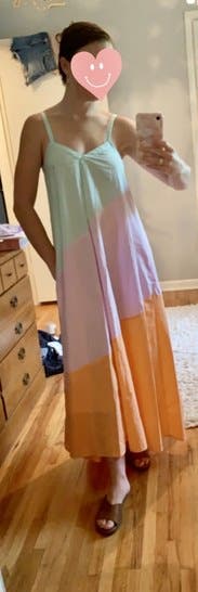 Loved the cut,the flowyness, the colors, the pockets, one of the straps kept falling off because it's a slide on setup but otherwise, perfect dress for a warm summer day with a cool fall night