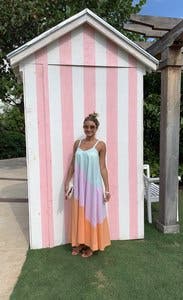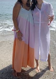 I rented this for a beach vacation. The colors and material are perfect, and the dress doesn't make you feel or look bigger even though it's flowy!