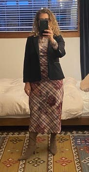 I wore this with black flare pants and again over a dress. Both times I felt like a million bucks. Very high quality. It has some extra details like the zippers that make it more interesting than your standard black blazer. It’s more of a shrunken style blazer, so be aware, but I found it to be incredibly flattering. Love and will rent again.
