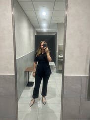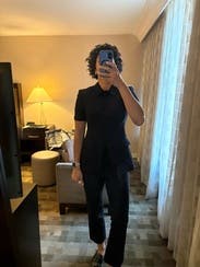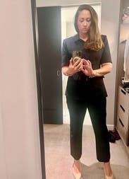 I work from home, and I loved this top for Zoom calls. When I’m not in a meeting, I often wear leggings and a sports bra. This was handy to just throw on over my sports bra when I needed to hop on a Zoom. I sized up a couple sizes because I was worried about the buttons gaping with my large bust, but I think I probably overdid it and could have gone with my normal size or just one size up. That said, nobody could tell it was too big on Zoom anyway. I also wore it to a birthday party for one of my kids’ friends, and I was able to make it work for an elevated play date outfit. If I ever have to go into the office and be seen in person, I might consider renting this again and getting the matching pants too.