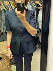 This suit is truly stunning- and like most VB - it’s all about the jacket. It’s hard to find a short sleeved jacket that makes sense but this one is classic and comfortable. I love the fabric- I think it is a black and navy floral brocade. The colour is so dark it’s hard to tell. There is a split hem which is so flattering for curvy figures and short torsos. You will need to wear high waisted pants with it for that reason. I am a 32/26/36 and the 2 jacket was perfect. No notes!