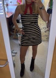 I love this dress, it was perfect for New Year's Eve vibe. However, it was pretty large in the chest and tight in the waist… I would read the other reviews to see what it would be like on you. But loved it. Wore it with this Cinq a Sept Jacket (also RTR)