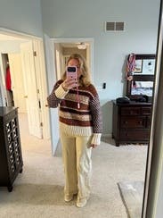 I don’t usually like horizontal stripes but this was a cute sweater. Warm and comfy. A good combination of neutral colors.