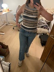 On the hanger this sweater vest was so cute! But when I put it on the oversized nature of the peace and length makes it look frumpy. I think I could’ve gone a size smaller. Maybe that would reduce the amount of fabric around the arm holes and length.