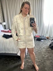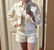 These shorts were cute and went with so much! I loved the eyelet denim, they were thick and held their shape after many wears. They were a great summer staple, along with the matching jacket. Fit was a little loose since I sized up.