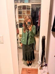 Loved everything about it: *Versatile: Easily transitions from day-to-night. I wore it with jeans, dressier leggings, and even denim cut-offs for a Zoom “I’m a professional from the waist up” look. *Beautiful Color: The green shade is perfect for autumn, although I wore it in the spring. Medium weight, so it will work in a California winter. *Petite-Friendly: Shoulders are perfect. I did roll the sleeves under for a bit more of a tailored look.