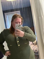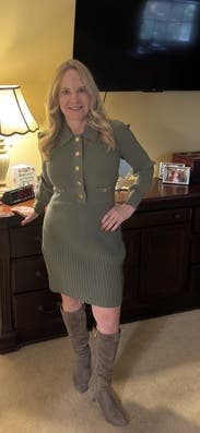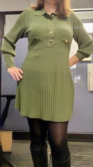 This dress hugs in all the right places and delivers effortless boss energy! The ribbed texture adds structure while keeping it comfy, and the gold button detail gives it just the right amount of polish. I wore it to a site visit/video shoot for a redevelopment project—felt powerful, feminine, and totally in command. The muted sage green feels like a luxe twist on a classic neutral. Would definitely rent again!