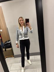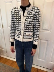 This sweater is perfect for a conference. I was told it looked Chanel. It is thick and the sleeves were a tiny bit short on me- if I wanted to button it I would have sized up to a Medium, but to keep it open the small fit perfectly. It’s so cute!!