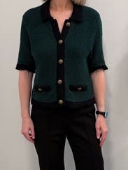 I loved this sweater so much and hated to part with it. It was extremely classic and elegant with the fit.The quality is so high quality and i loved the dark green color and the gold button accents. It was perfect for a client meeting and family event. The sweater is a bit cropped and I wore some high waisted black bootcut jeans with it