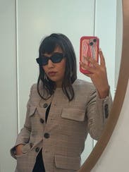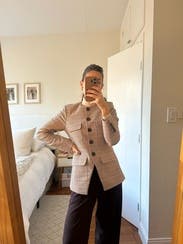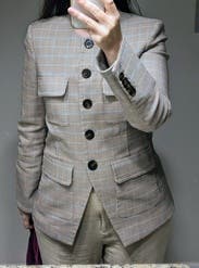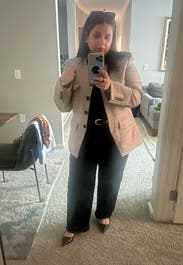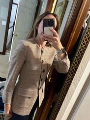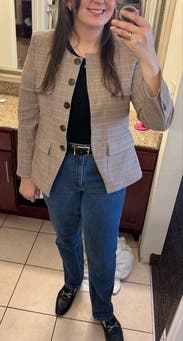 Loved this blazer. It is stretchy and breathable but reads fall ready. It is easy to simply button up and go. Surprisingly versatile. Loved it with jeans and brown trousers. Very flattering, easy to style, and interesting. I loved the split hemline - it looks great for curvy figures/short torsos. Will absolutely rent again.