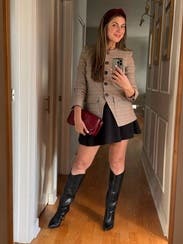 Paired this with a turtleneck on a cold fall day! Lots of compliments and the style is really nice, but it was a little big on me so made me look frumpy.