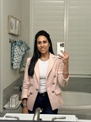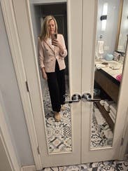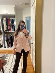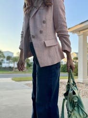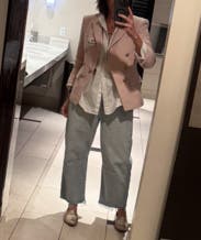 Love wearing this three quarter light pink jacket to get that biz casual look