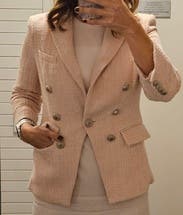 A perfect fit in the shoulders, looks classic and elegant, but it feels like a security blanket. Such a pretty soft pink with a beautiful texture. Beautiful silk lining inside. Absolutely recommend.