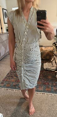 Fun and feminine spin on menswear. Covered all the right places even on larger chest and ruching was flattering around belly and hips. Definitely one of my go to designers for work.