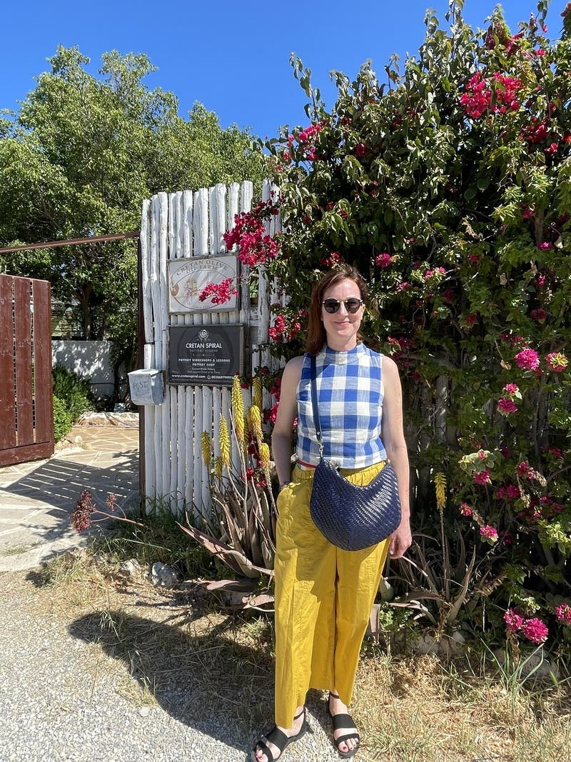 Blue gingham cotton blend (90% Cotton, 9% Polyester, 1% Elastane). Top. Mock neck. Sleeveless. Back button closure. 17.5" from shoulder to hemline. Imported.