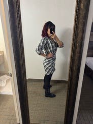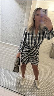 Plaid plain pattern makes a statement with the way this dress drapes on your frame. Surprised how much I liked this dress. Wore regular bra with it.