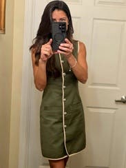 I received a bunch of compliments on this one. Also, the buttons have a nice shield detail on them. They elevate the look. I wore with knee high brown suede boots for a fall look.