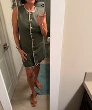 Green color block (55% Lyocell, 42% Cotton, 3% Elastane). Casual dress. Crew neck. Sleeveless. Non-Functional Buttons. Back zipper closure. Shoulder to hemline: 34". Imported.