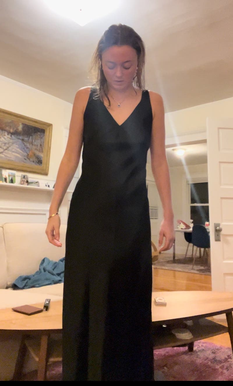 Black satin (100% Naia TM Acetate). Slip. Sleeveless. V-neck. Pull on. 54" from shoulder to hemline. Imported.