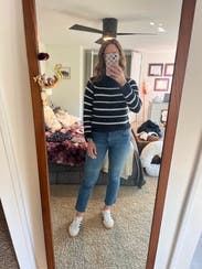 Black striped (83% Cotton, 17% Polyamide). Knit. Crew neck. Long sleeve. Pull on. Shoulder to hemline" 21". Imported.