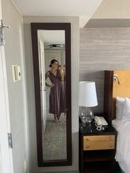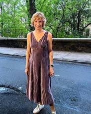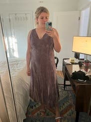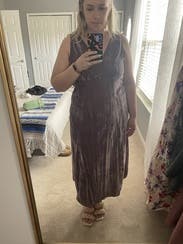 Was so happy to see this in person. The fabric is beautiful and sooo comfortable! I had to pin the straps as the top was too large. If you are deciding between sizes and are smaller on top size down.