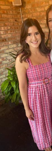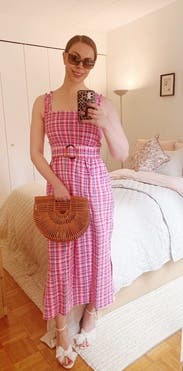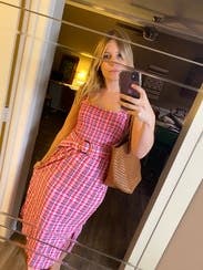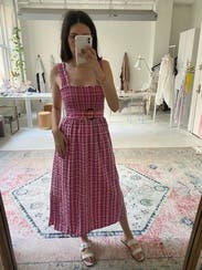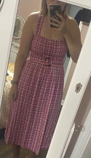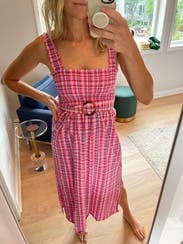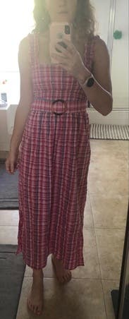 Perfect for summer days. Smocked up top, right amount of give on bottom where it’s a straight fit but not tight on hips. Didn’t have to wear a bra. Belt is removable.