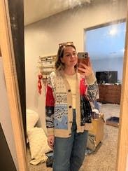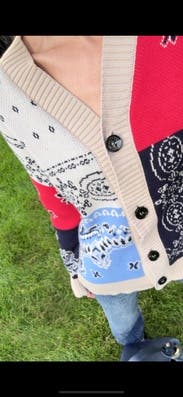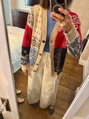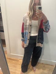 Obsessed with this cardigan’s pattern, super comfy and not itchy at all. It runs oversized (I could’ve gone down a size and it still would’ve been roomy), which works for the relaxed look. I styled it buttoned up with both shorts and jeans and got tons of compliments. Such a fun piece to carry from summer into fall.