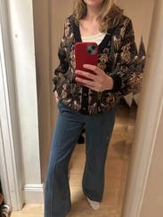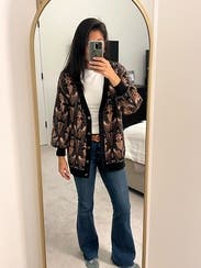 Got lots of compliments on this pattern! Fit is oversized. Showed up brand new, with the tags still on. Very cute for everyday wear.