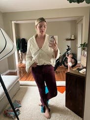I liked this top, but would have liked it even more if the sleeves weren’t SO LONG! I thought that it would be silky, but it’s a sturdy cotton material. I rented a M-L but would size down next time.