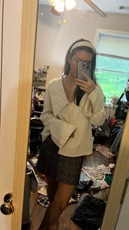 Looks cute on model, but it’s big in person. Too big to tuck in and look right. It was even an xs/s.