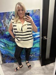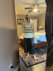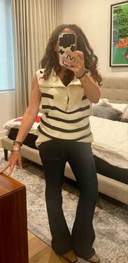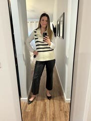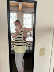Very fun sleeveless sweater. Material is heavier than I anticipated, but the oversized fit is flattering and fun!