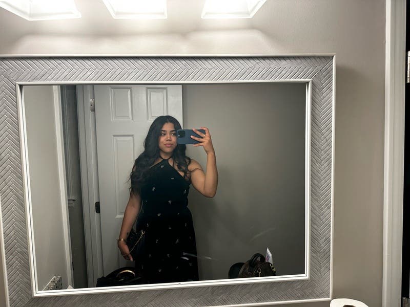 Black floral velvet (94% Polyester, 6% Spandex). A-line. Sleeveless. Tie neck. Pull on. 51.5" from shoulder to hemline. Imported. Please note: the detachable rosette is no longer included with this style.