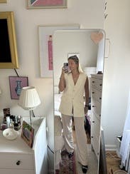 Loved the chance to try this trend. Paired these with jeans and a cream tank and heeled boots. The shoulders felt a little big. Not personally crazy about a sleeveless top so it's sort of on me, but it was a fun trendy item that I got out of my system lol.