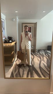 This piece was a perfect fall transition piece in September in NYC as the weather kept changing between hot and cold. Wore a monochromatic cream look on a nice day with heels to the office and then with a black the next week and platform boots the following week. The vest can do it all. The vest fits oversized so size down if you want more fitted. The V is pretty deep so I’d recommend wearing a tank top under to avoid a wardrobe malfunction. 9/10 slay. Follow @livworewhat for more!