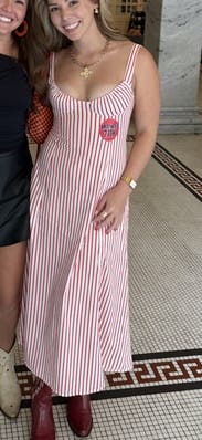 Loved this dress for an Ole Miss football game! So flattering on smaller chests, but might not work as well for larger chests!