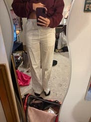 Didn’t like these at all. I thought they were linen but they’re like 90s track pants material. Super long so great if you’re tall. Pocket outline can be seen through the pant. I didn’t wear theses