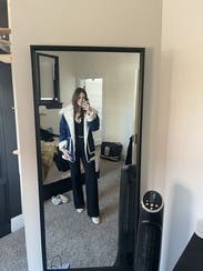 This Wrangler denim jacket offers a cozy and rugged appeal with its sherpa lining and contrasting trim. It pairs effortlessly with casual staples, like a simple tee and boots for a classic Americana look.