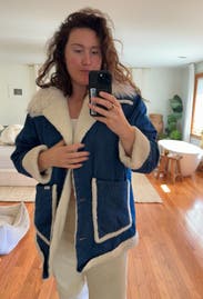 Blue (100% Cotton outer, 100% Polyester lining). Coat. Long sleeves. Front button closure. 31" from shoulder to hemline. Imported.