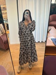 I was 50/50 on renting this dress - thought it may look frumpy but it is super cute! Has a cute shape to it and a great fit! It is a maxi dress but doesn't have too much material. Wore to work with black flats and then another time with tennis shoes. It is extremely comfortable and true to size!