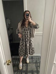 This dress was so flattering and comfortable. Especially with a post-baby belly, the dress skimmed right over. I felt so confident and put together even with white sneakers or Birkenstocks to run errands. Light enough to wear on warmer days but with the length and sleeves also great on the cooler early fall days.