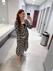 Wore this twice at 33-34 weeks! Very comfy and flowy and fit well just sizing up one size. The V is pretty deep, so I wore a black cami underneath for work