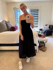 I loved this dress so much I thought about buying it. It is not a full length maxi dress. It hits a little bit above the ankles on me, but it was perfect with a cute pair of flat black sandals. Also, I love a strapless top because you can do whatever jewelry you want. I wore those over to a friend‘s house for a boat ride and barbecue and I also wore it to my best friends bridal suite pre-wedding festivities. I found myself gravitating to it when you need something cute and classy to throw on, but don’t want to put a ton of effort in.