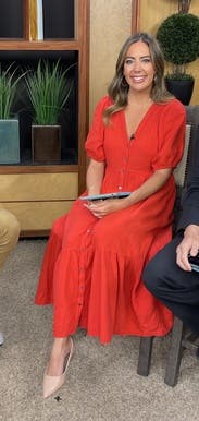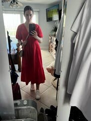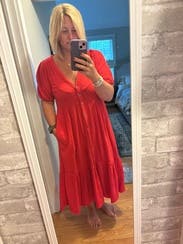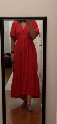 Great dress for spring/summer vacation - wore to a museum, to lunch, could dress up with different shoes and jewelry. Color is tomato red, not a lot of structure but instead, very flowy - incredibly soft, and flattering in its own way. May run oversized a bit, but that’s part of the style. Loved the sleeves