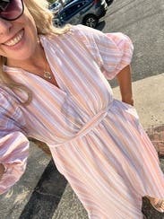 Loved this very feminine dress! Perfect for the nice weather and super comfortable! In my opinion it runs a little big so I would recommend a size down. I could have worn a Small. I am short and with a heeled shoe it hit my foot so it’s a little long which I didn’t mind. The only reason for the 4 stars is that the material wrinkles easily but was able to wear nicely. I tied in the back with a big pretty bow! Wore to a religious event but perfect for brunch or everyday or a summer vacation! Can dress down with a different shoe.