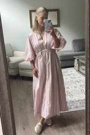 This YERSE midi dress features a soft striped pattern and a flattering wrap design with a belt, giving a relaxed yet chic vibe. Pair it with sandals and a simple clutch for an effortless summer look.