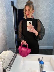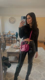Sometimes I like to go matchy matchy and with my birthday outfit (Ronny Kobo Garner Knit Top, Tibi Brancusi Jeans, and the Osman Yousefzada Collective Faux Leather Trench Coat) I knew I wanted to elevate that pop of pink. It is a small purse but I loved the sculptural knotted top and fuchsia color.