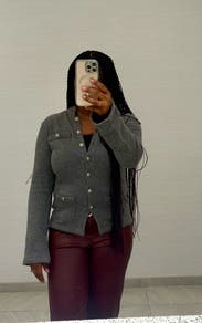 Nice and warm and good silver details! Long in length so I wore with low rise jeans and silver loafers. Comfy and perfect size.