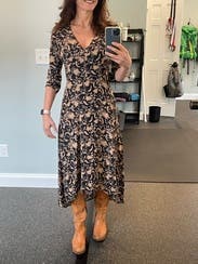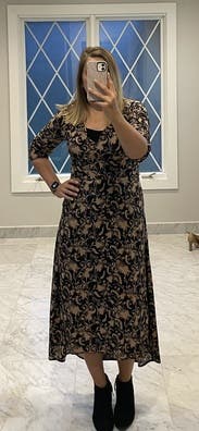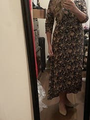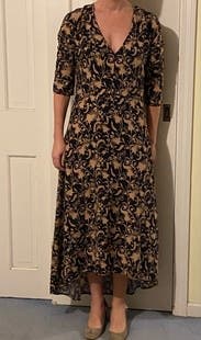 Wow, this dress. Totally my style of relaxed, casual, but my goodness, this dress elevated that to a new level. Gorgeous print. Fit so well around the bust/torso/shoulders which is usually my sore spot. A tad bit loose around cleavage. I'm 5'4" and needed to wear 3 inch heel booties to avoid dragging the fabric. I felt like an ethereal damsel walking in the woods on a beautiful fall evening. Dress got many second looks. Loved the unassuming style. Would buy if I could drop $1k on one dress.