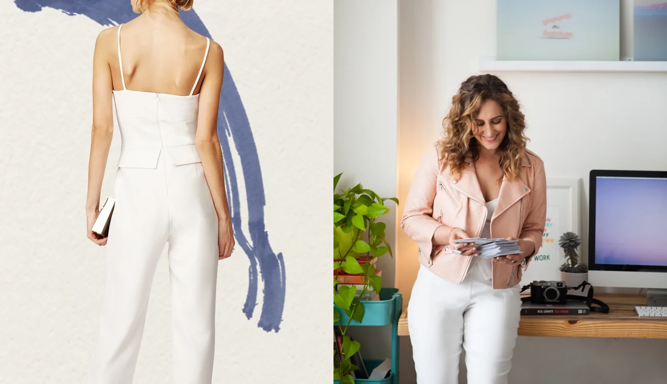 Jumpsuit, Trina Turk; Jacket, Rebecca Minkoff