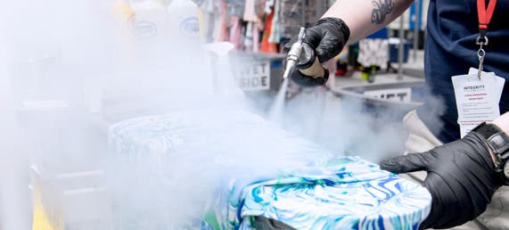 Our conscientious cleaning processes, focused on both wet- and dry-cleaning, use biodegradable detergents that are free from added fragrances and zeolites. We do not use (and never have used) any halogenated cleaning solutions such as toxic Perchloroethylene (PERC). After going through our rigorous cleaning processes, pieces pass through a steam tunnel between 248°F and 302°F and are immediately sealed in plastic to protect them from any additional handling.Our conscientious cleaning processes, focused on both wet- and dry-cleaning, use biodegradable detergents that are free from added fragrances and zeolites. We do not use (and never have used) any halogenated cleaning solutions such as toxic Perchloroethylene (PERC). After going through our rigorous cleaning processes, pieces pass through a steam tunnel between 248°F and 302°F and are immediately sealed in plastic to protect them from any additional handling.